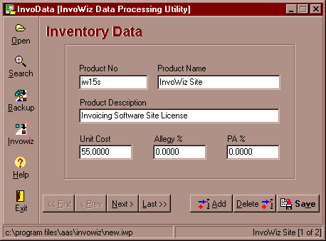 InvoData Version 1.0 of InvoWiz was designed to generate a quick, one-time invoice without storing the product or customer information. We quickly learned that no matter how quickly an invoice is required, and no matter how little business is expected from a particular customer, it is essential to maintain customer and product data. Database capabilities were not built into the initial InvoWiz release to avoid the overhead associated with database engines. With version 1.3, Applied Analytic Systems developed its own file structures for storing product and customer data, thus avoiding the database engine overhead, while providing a reliable and fast structure for data maintenance. The InvoWiz Invoicing Tools package introduces InvoData, a new utility that allows InvoWiz users to have complete control over their InvoWiz data.